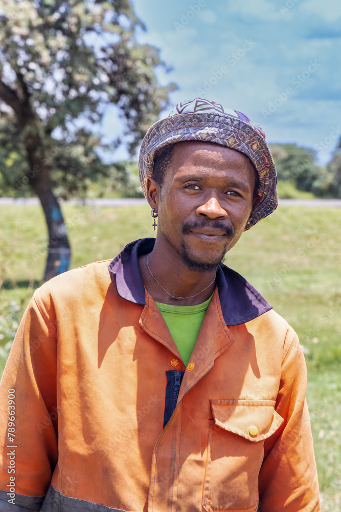 village young african man ,wearing orange workwear and as beanie ,green field and tree