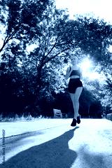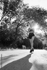A young woman maintaining her fitness by running in a sunny park, showcasing a healthy lifestyle and morning exercise routine.