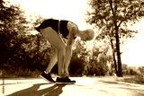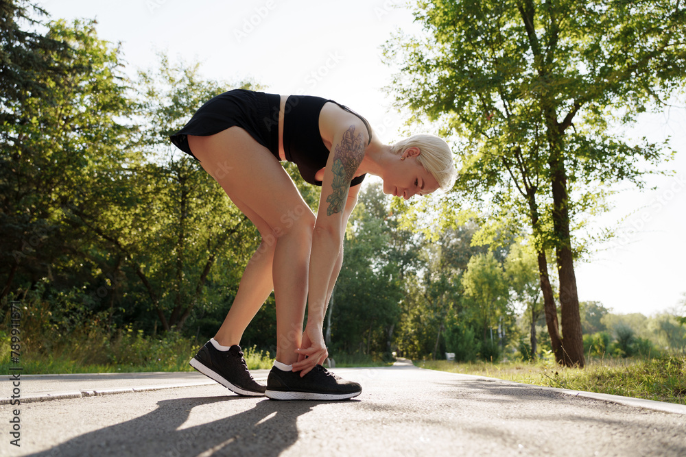 A young active woman pauses for a breath during her run in a serene park, tying her shoe, surrounded by lush green trees.