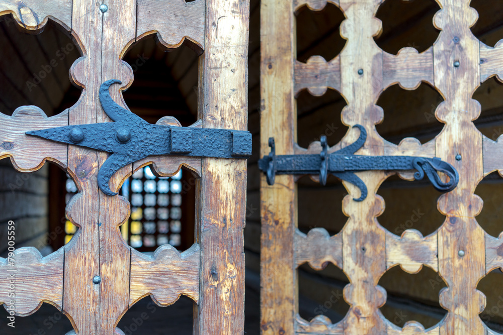 Old wooden door with rusty metal hinge