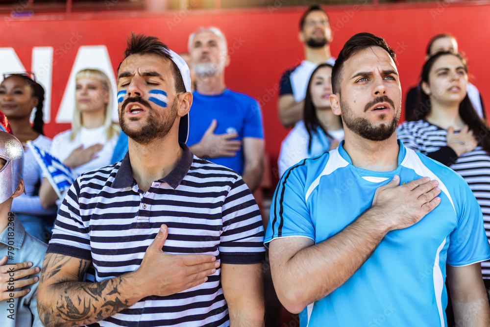 Sport fans singing national anthem of their country at the stadium. Wearing blue and white to support their team.