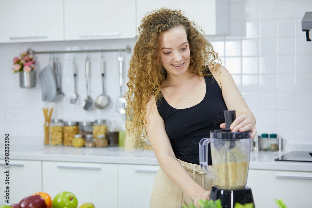 young woman mixing fruits from portable blender and preparing smoothie in kitchen
