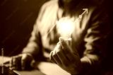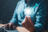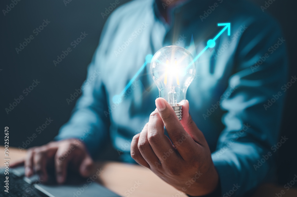brainstorm, thinking, genius, global, imagination, insight, intelligence, invention, solution, strategy. A man is holding a light bulb in his hand, Concept of innovation and creativity.