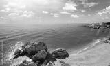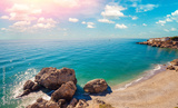Seascape on a sunny day. Caletilla Beach with the beautiful sky. Promenade in summer. View from Mirador de Chanquete, Nerja, Malaga, Spain