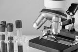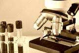 A microscope with a slide containing red blood cells. Microscope is on a laboratory table next to a few red blood cell tubes.