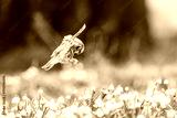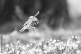 boreal owl or Tengmalm's owl (Aegolius funereus) sitting on a forest pallet full of snowbells