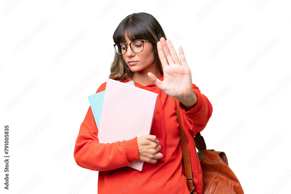 Young student caucasian woman over isolated background making stop gesture and disappointed