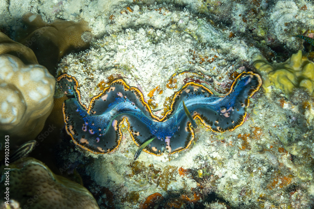 Close up of Colorful giant clam Tridacna gigas grows in the shallows