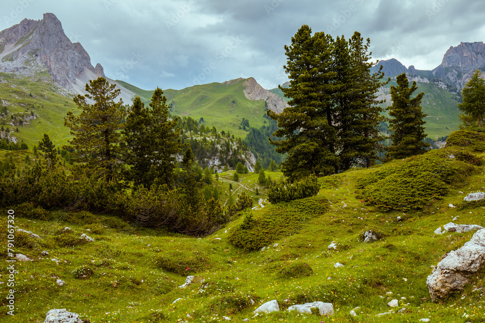 landscape with hills, clouds, meadow and trees