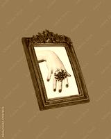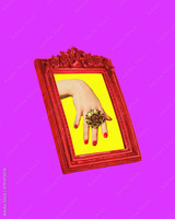 Female hand in picture frame with luxurious gold ring on finger. Contemporary art. Creative poster for jewelry store, beauty salon and self-care services. Concept of surrealism, pop art, creativity