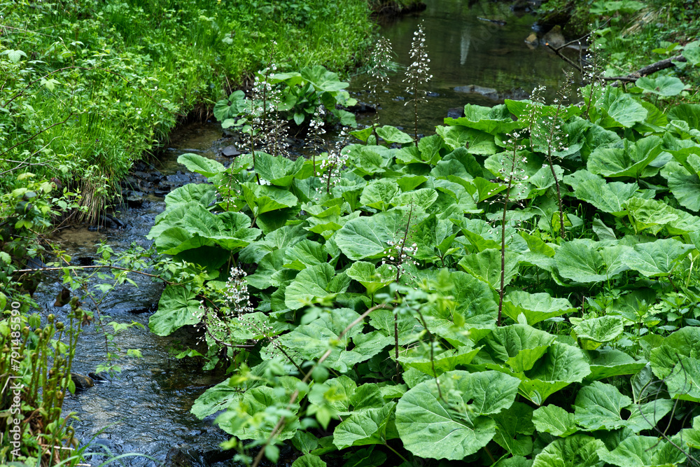 Przekwitły z rozwiniętymi liśćmi Lepiężnik biały (Petasites albus) często można go spotkać wzdłóż lesnych strumieni