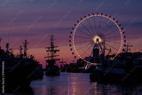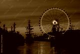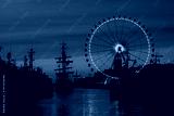 SEA PORT - A small tourist ship in harbor at dusk against background of ferris wheel