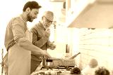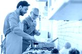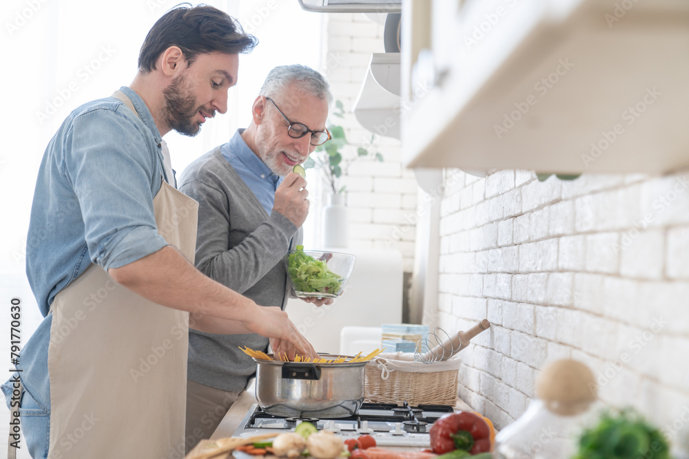 Happy cheerful young son helping his old senior father in preparing meal, food, dinner, lunch in the kitchen. Family time, cooking pasta spaghetti together. I love you, dad! Happy father`s day!