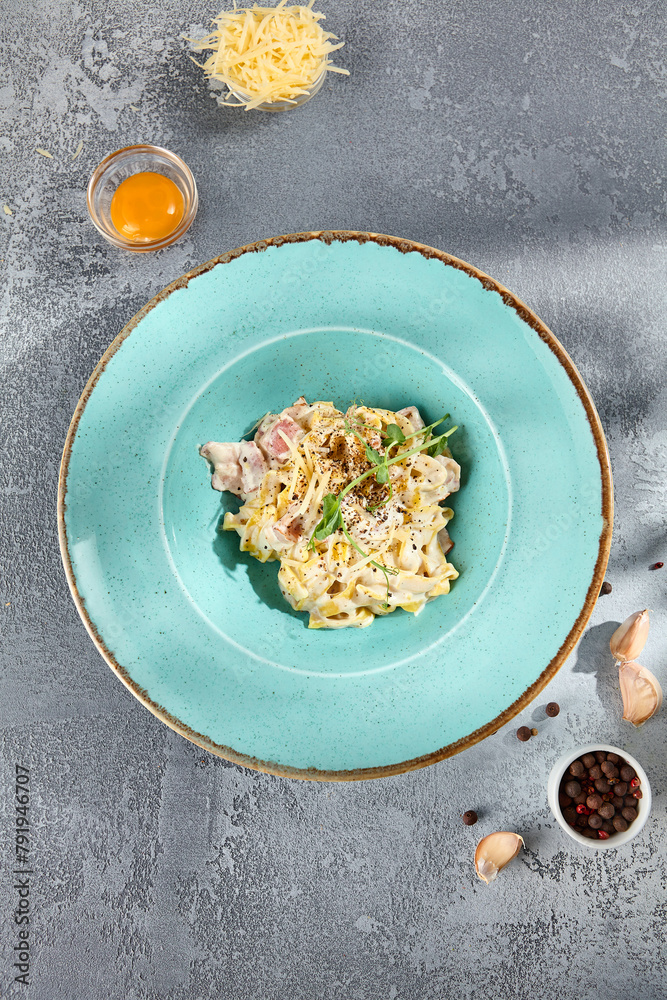 Top view of creamy Carbonara pasta with a raw egg yolk on the side on a turquoise plate, garnished with herbs and pepper