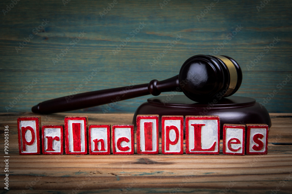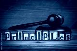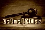 PRINCIPLES. Red alphabet letters and judge's gavel on wooden background. Laws and justice concept
