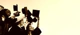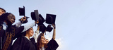 Group of happy multiethnic high school, college or university students having fun on graduation day and raising their graduate hats up to clear blue sky. Copy space banner background