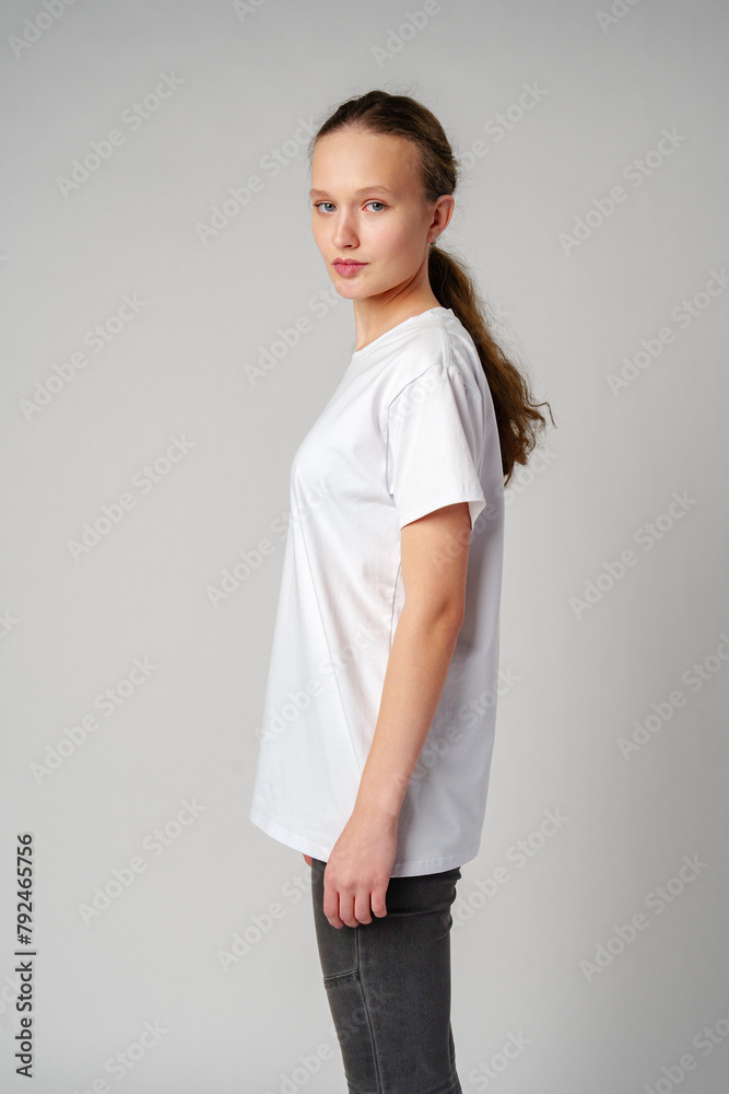 Beautiful young girl posing in white T-shirt and jeans on gray background