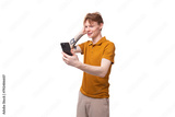 a young guy with short red hair dressed in a summer T-shirt uses social networks in a smartphone