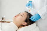 Specialist of hair recheck hair of Asian woman, damaged hair, hair loss, thinning problem, vitamin deficiency, baldness, postpartum, biotin, zinc, menstrual or endocrine disorders, hormonal imbalance.