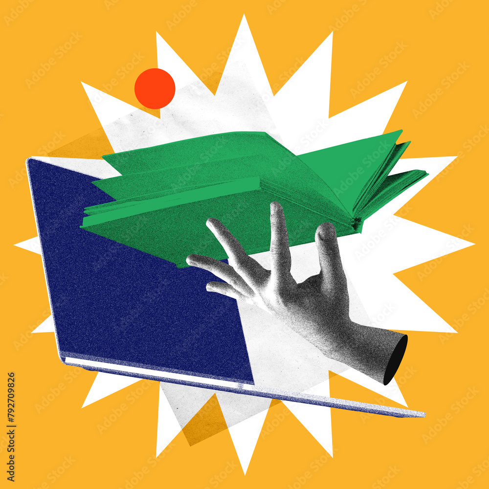 Human hand with book and laptop. Contemporary art collage. Fusion of digital and traditional learning resources. Concept of online education, e-learning, modern technologies and innovations