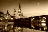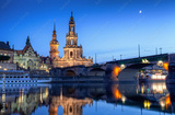 Dresden at dusk reflected in water of Elbe. Cathedral of the Holy Trinity