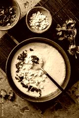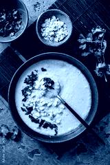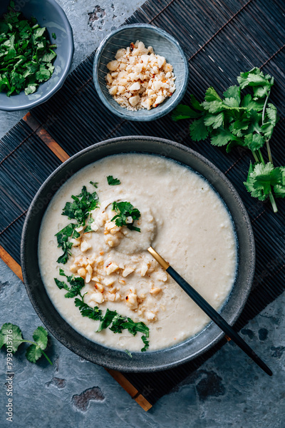 Spicy and creamy cauliflower and coconut soup with cilantro and macadamia nuts
