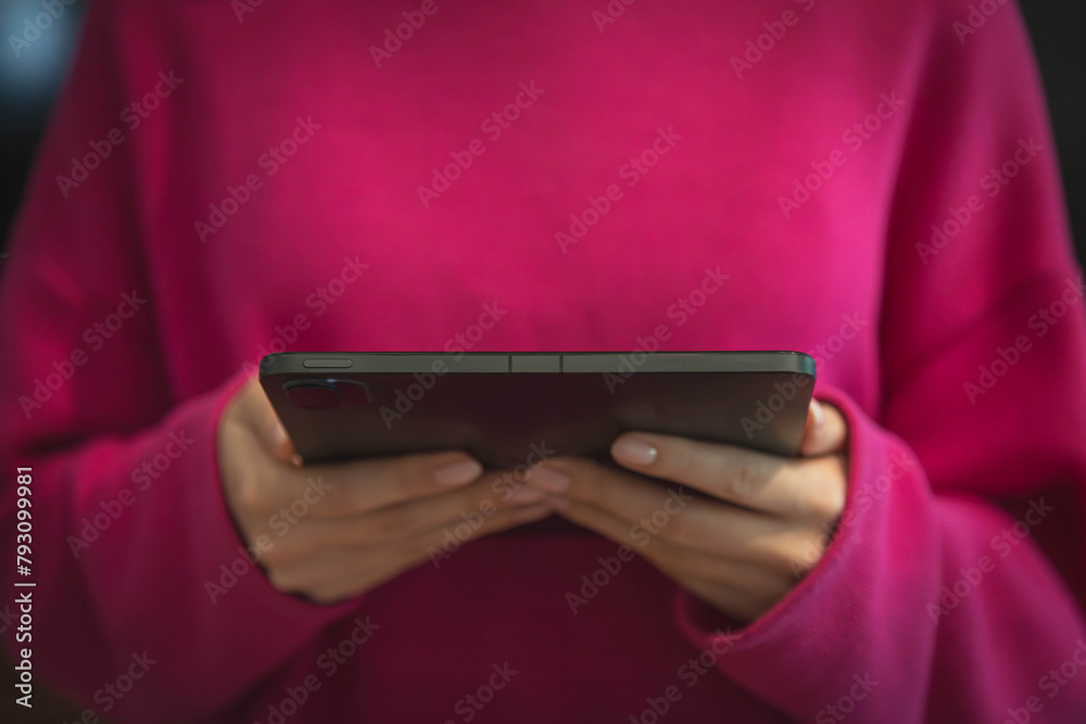 Young girl uses a digital tablet on a dark background