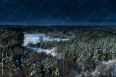 Winter panorama. Dark, frozen trees, bushes and roads.