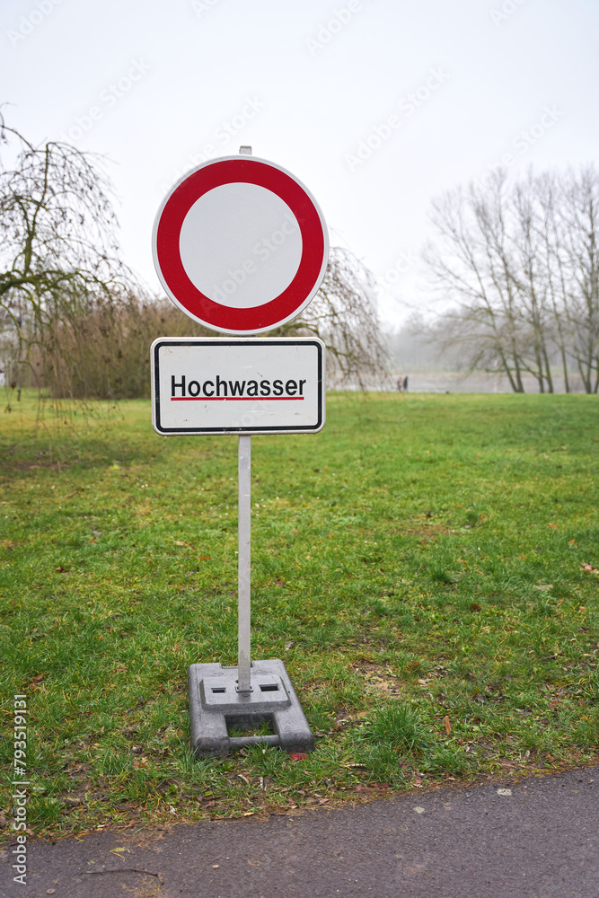 Schild mit der deutschen Aufschrift Hochwasser während einer Flut im Januar 2024 in Magdeburg