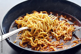Instant noodle soup with fork and spoon in a bowl. Spicy noodles. Asian food style.