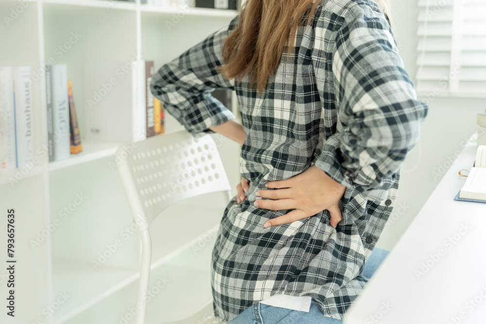 woman holding her lower back while and suffer from unbearable pain health and problems, chronic back pain, backache in office syndrome, scoliosis, herniated disc, muscle inflammation