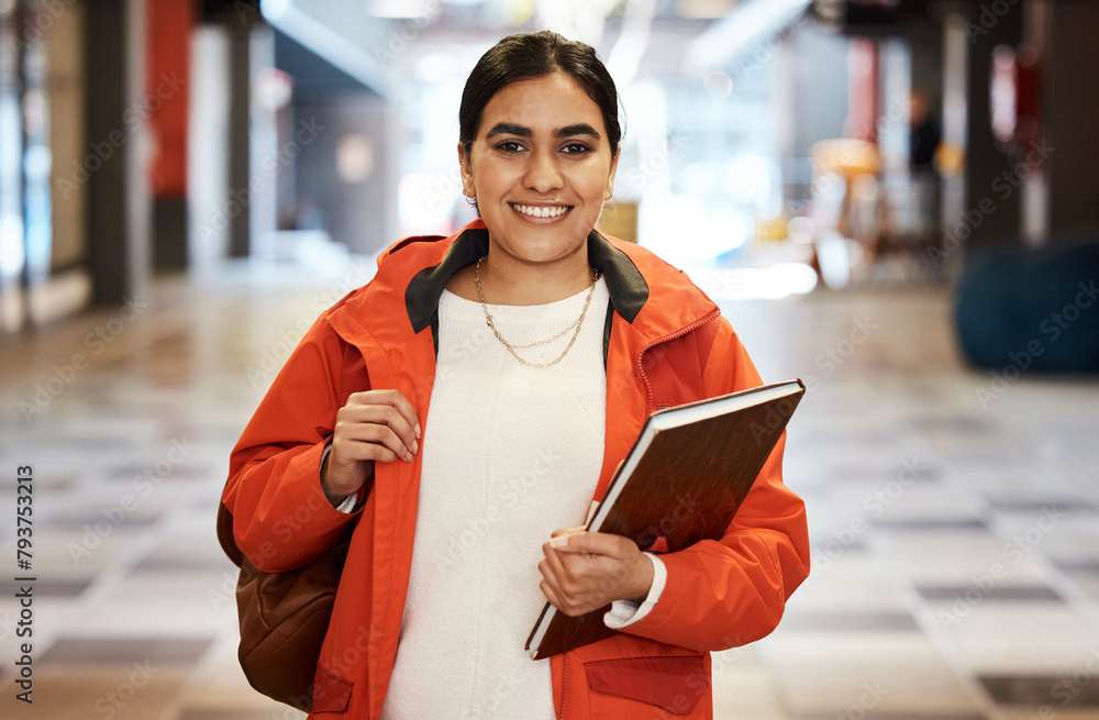 Books, portrait and study of student Indian girl on campus for learning at college or university. Bag, education and smile with happy academy pupil at school for development, knowledge or scholarship