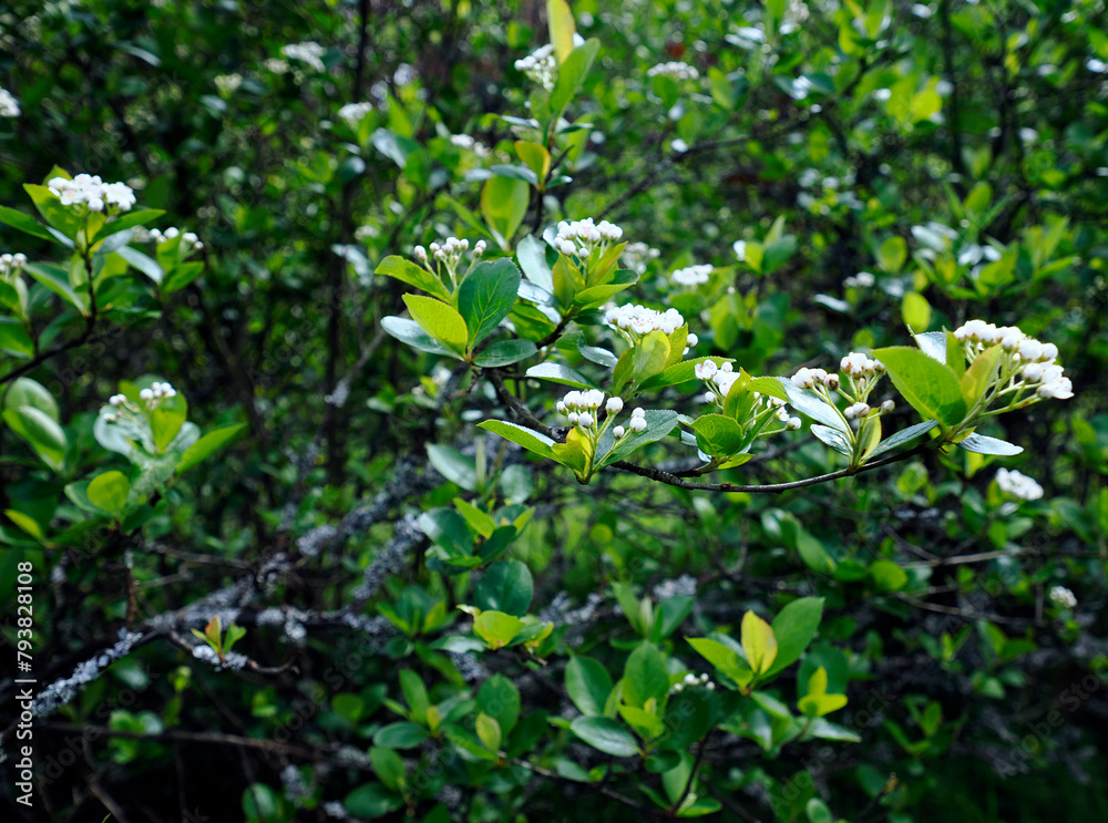 Kwitnąca Aronia w ekologicznej uprawie. Obecność porostów na gałązkach aronii świadczy o nieskarzonej glebie i czydtm powietrzu. Porosty nie tolerują środków ochrony roślin, ich obecnośc jest koronnym