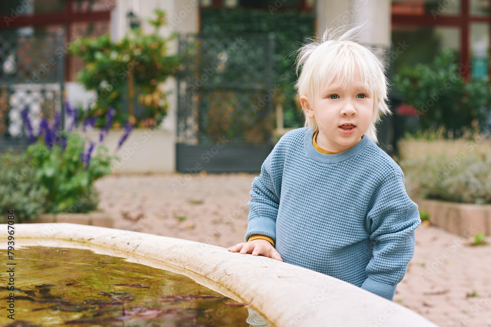 Outdoor portrait of adorable little boy playing outside