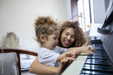 Funny Girl amd Happy Mother Play on Piano Together. Hobbies For Mother and Young Daughter. Happy Mother with Little Girl Play on Piano. Positive Day for Beautiful Woman. Young Daughter.