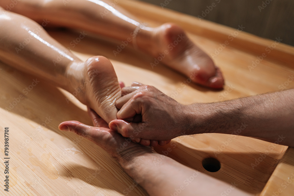 Relaxation foot massage with aromatic oil in spa salon with dark interior. Close-up of professional masseur male acupressure massage on feet of unrecognizable woman client in wellness center.