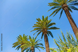 An image of three palm trees in the blue sunny sky. Copy space, Sunny background.