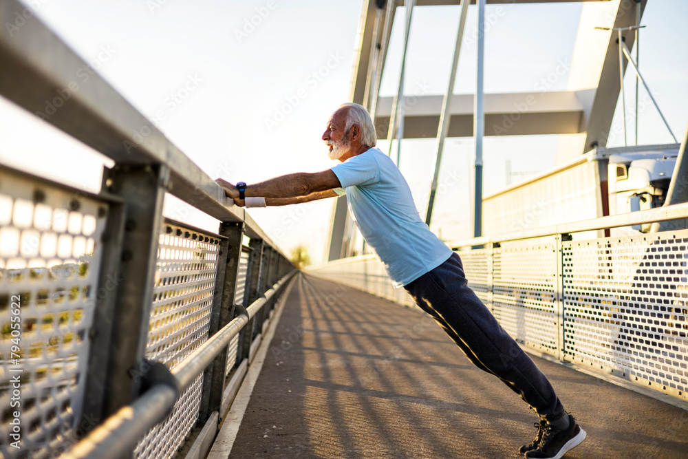 A mature man stretches his arms on a bridge and warming up for training. A mature man stretches his arms.