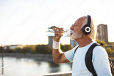 Closeup photo of handsome grey-haired mature sportsman drinking water during workout outdoors. Closeup of mature sportsman drinking water during workout outdoors.