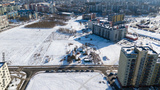 Drone photography of old household surrounded by multistory apartment block urban sprawl during winter day