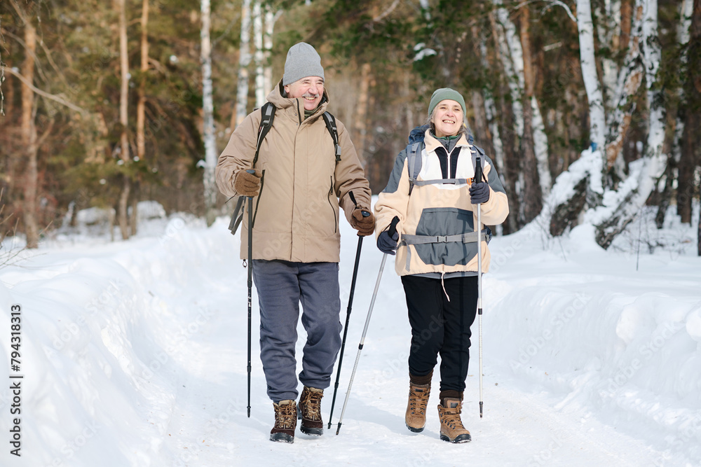 Long shot of modern senior Caucasian man and woman hiking along forest with use of trekking poles on winter day, copy space