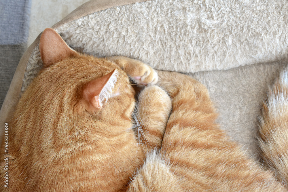 Ginger cat sleeping in cat bed at home. Happy tabby cat relaxing in a house. Flat lay top view photo.