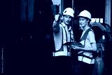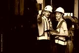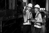 engineers or workers checking and pointing to something at construction train station