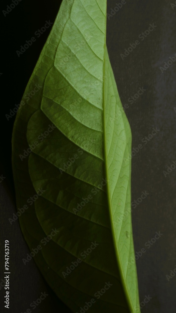 Close up green leaf isolated black, natural green and black textured background