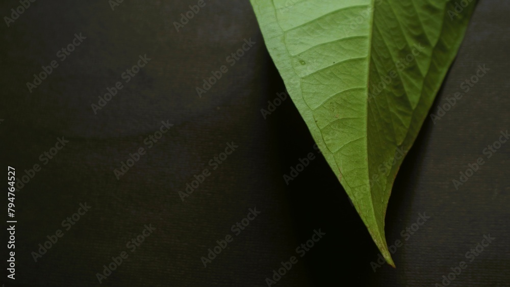 Close up green leaf isolated black, natural green and black textured background