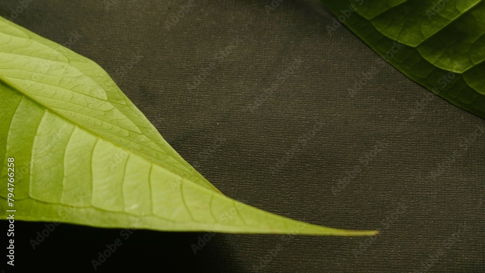Close up green leaf isolated black, natural green and black textured background