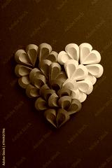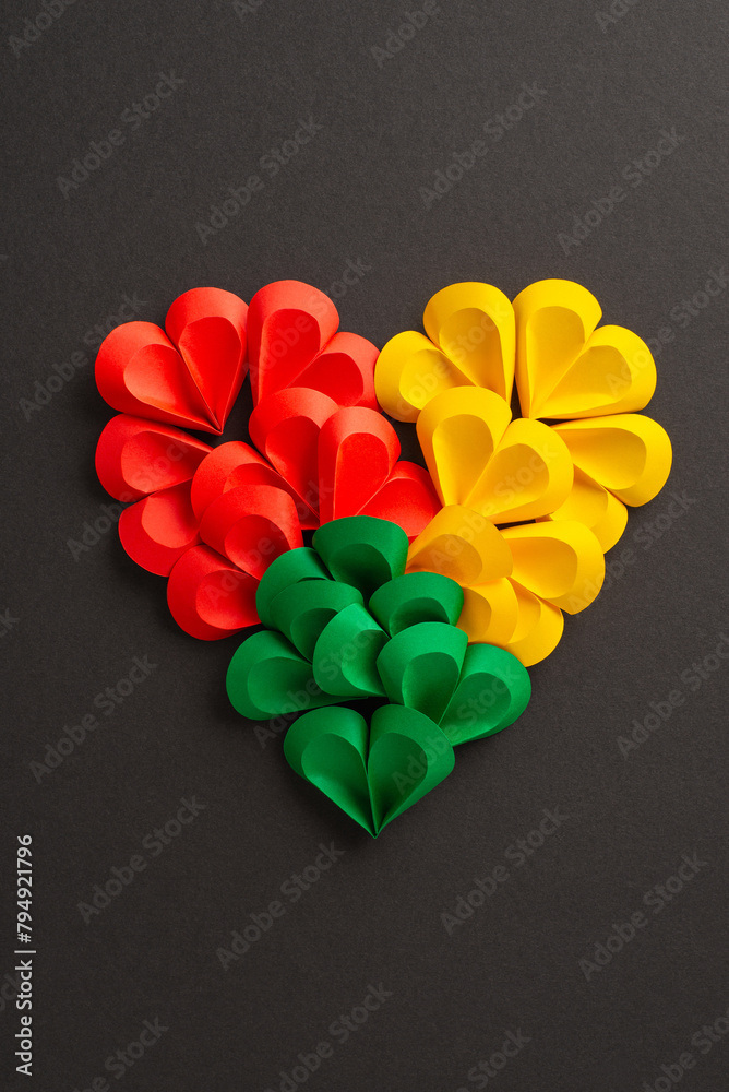Top view vertical perspective reveals heart-shaped arrangement of small paper hearts, reflecting Juneteenth's color scheme - red, green, yellow on black background, ready for social content or advert