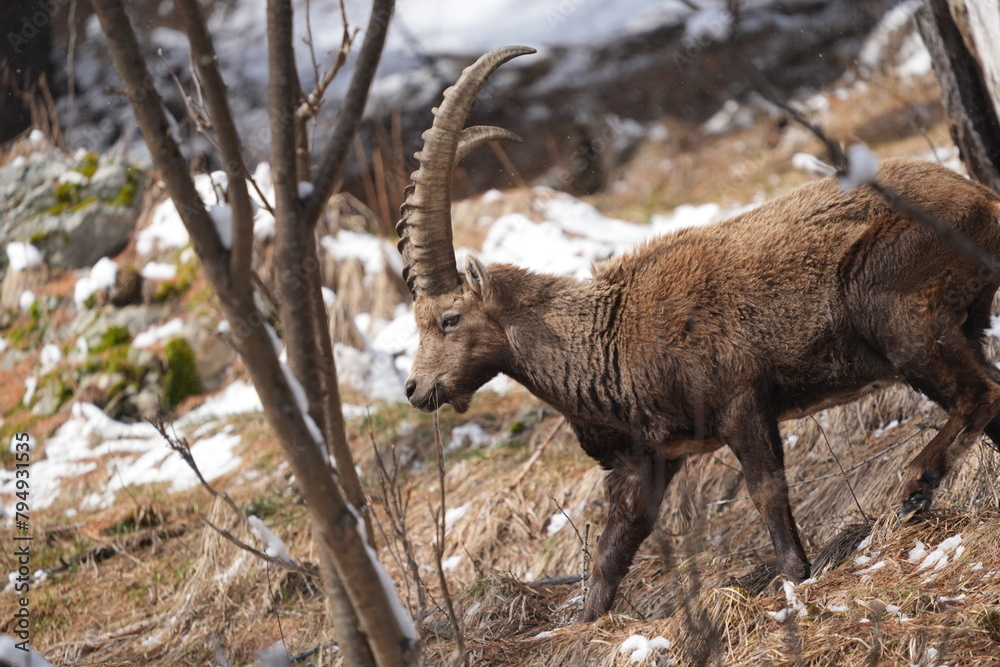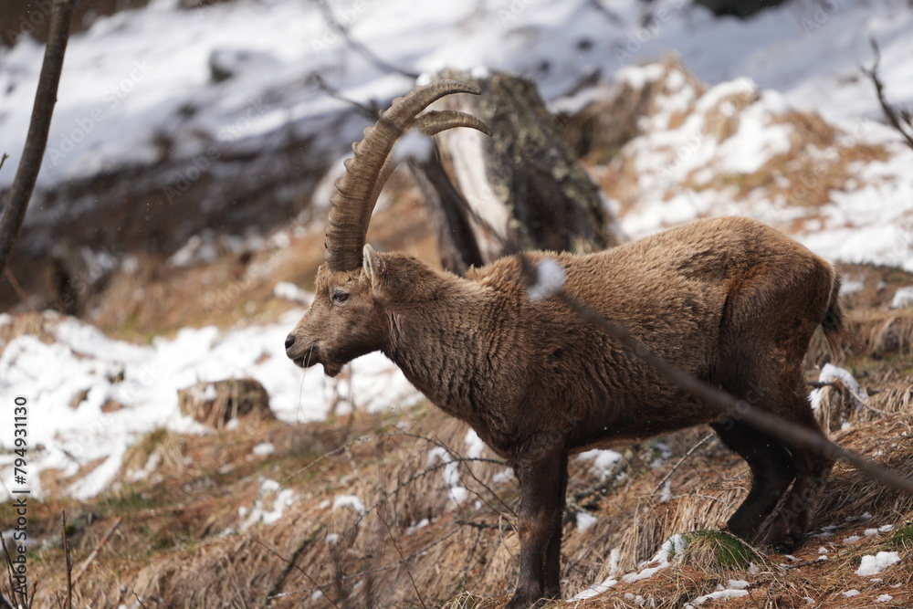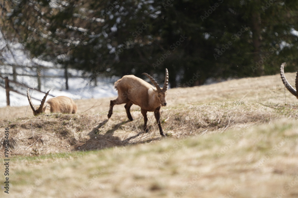 herd of steinbock capricorns grazing in Pontresina, Graubuenden, during summer. Ibex herd.