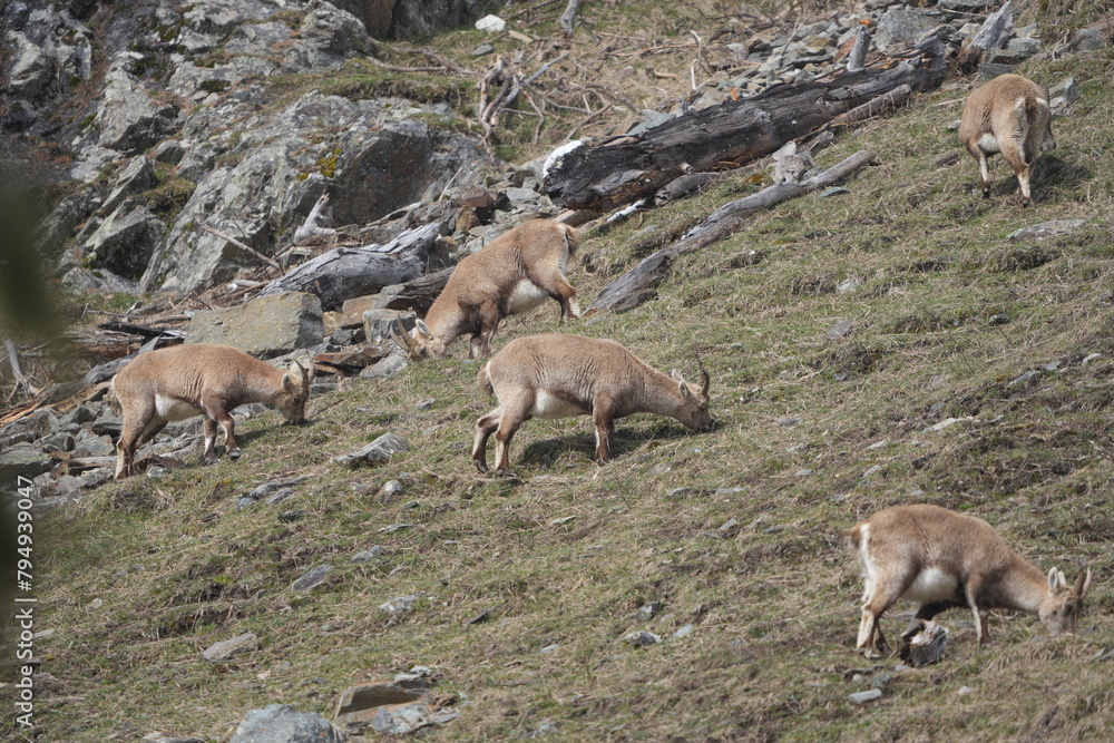 herd of steinbock capricorns grazing in Pontresina, Graubuenden, during summer. Ibex herd.