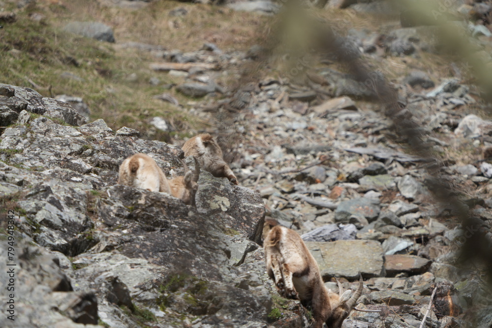 herd of steinbock capricorns grazing in Pontresina, Graubuenden, during summer. Ibex herd.
